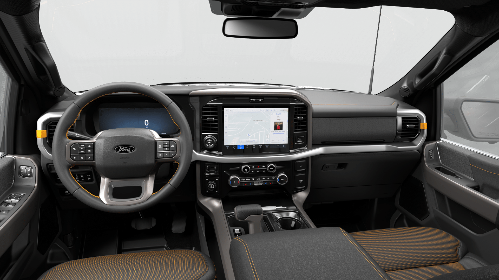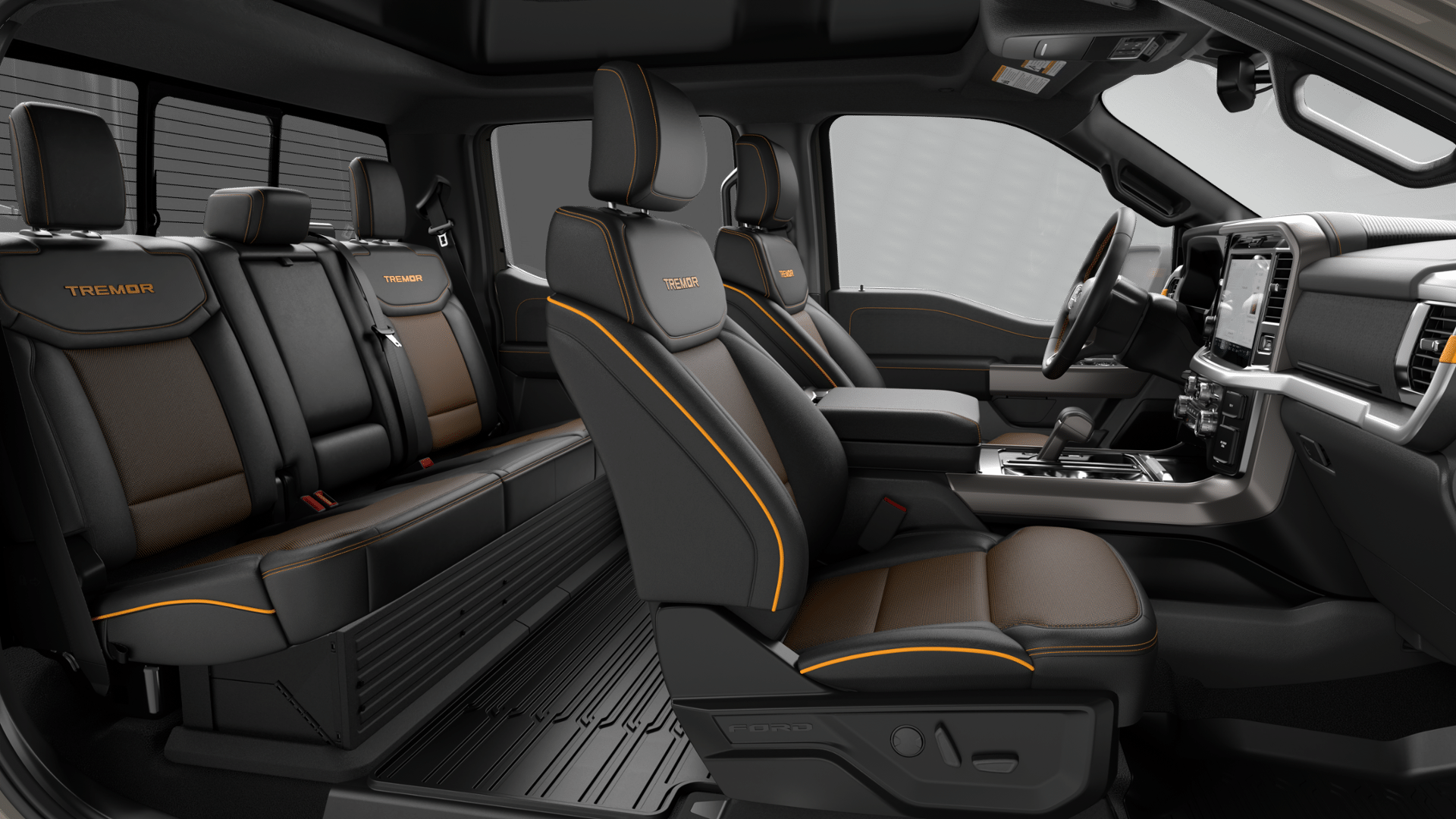 SYNC 4 with a 12-inch center display, voice-activated navigation, and multiple 120V AC outlets make the F-150 Tremor’s cabin more tech-rich and practical than the standard interiors in competing off-road full-size trucks.
