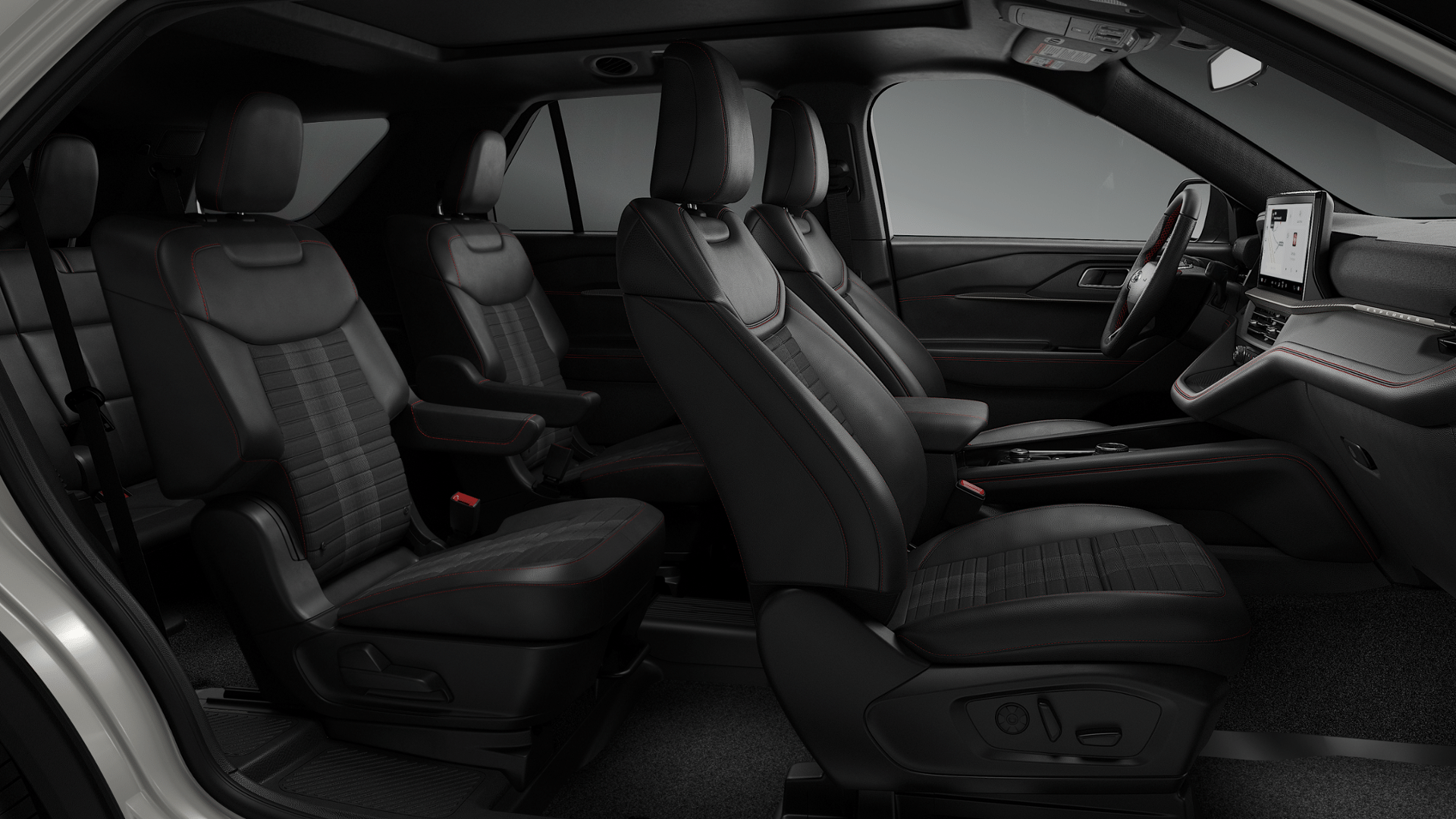 Both the steering wheel and front captain's chairs are heated for added cold-weather comfort, and the seats feature distinctive red stitching and multi-way power adjustments for both driver and passenger.